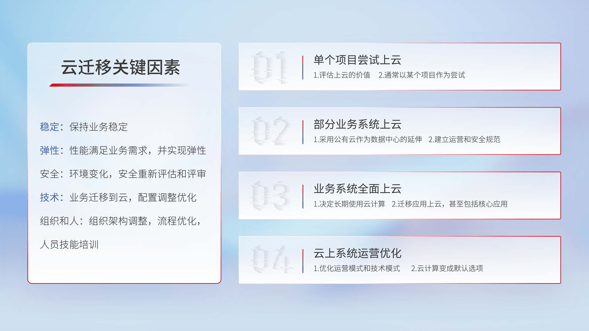 结合实际业务,,从规划设计、、、云平台选型、、、云原生改造、、、数据迁移、、、、集成交付,,,,迁移全过程为客户识别最佳上云路径,,,,做好风险识别管理,,,,设计网络架构、、、身份权限、、、安全审计合规、、、操作审计、、、、日志审计、、、、监控告警策略、、、多站点容灾设计等,,,对云上基础设施进行整体规划,,,提升IT治理水平,,以满足弹性、、、高可用、、高性能的需求。。。